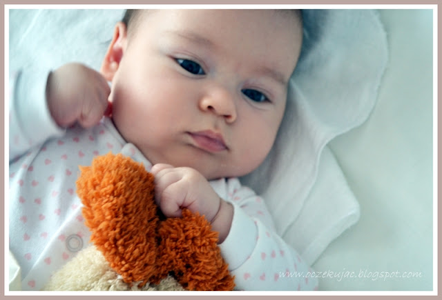 Co mogę powiedzieć o naszych pierwszych trzech miesiącach? Mogę powiedzieć, że UWIELBIAM! Uwielbiam, kiedy Gabi od rana gaworzy i śmieje się do lustra; uwielbiam zmieniać jej pieluszkę 20 razy dziennie; uwielbiam przebierać ją zaraz po tym, jak podczas zmieniania pieluszki obsiusia śpioszki; uwielbiam nosić ją na rękach, przytulać, głaskać; uwielbiam spać z Gabi w naszym łóżku; uwielbiam na nią patrzeć, kiedy się bawi, śpi, kąpie; uwielbiam wymyślać dla Gabi nowe przezwiska; uwielbiam śpiewać jej piosenki; uwielbiam rozmawiać z Gabi; uwielbiam spędzać z nią czas.
