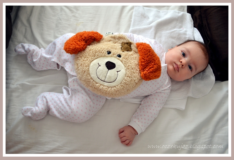 Nie sądziłam, że będę taka dumna i że będę tak bardzo cieszyć się z pierwszego chwytu. Kiedy zobaczyłam, że Gabi ciągnie psa do góry (wcześniej był na jej brzuszku – problemy trawienne od rana) myślałam, że chwyciła psa przez przypadek za uszy. Jednak zabawa trwała parę ładnych minut – i Mamusia zdążyła uwiecznić pierwszą zabawę z pluszakiem 🙂