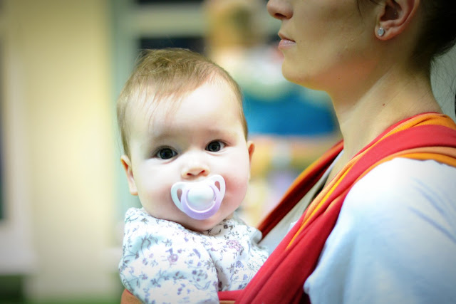 Myślałam, że nie będę miała problemu z powtórzeniem paru prostych kroków salsy. Jednak okazało się dzisiaj, że albo jestem za stara na takie salsy albo mam refleks szachisty, bo za nic w świecie nie mogłam pojąć tych wszystkich kroków, obrotów i zrobić całego układu tanecznego z dziewczynami tak, aby się nie pomylić! Myliłam się co chwilę, robiłam obroty w drugą stronę a prawa stopa zawsze sama się rwała do kroku zamiast lewej. Trochę to tańczenie jest skomplikowane, ale wytrzymałam całą godzinę 🙂 I jeszcze moje dziewięcio kilogramowe obciążenie cały czas było ze mną 😉 Podobno niektóre dzieci zasypiają w chuście. Myślałam, że Gabi też będzie chciała zasnąć. Nawet podałam jej smoczka, aby nic jej nie rozpraszało. Jednak atrakcji było co niemiara i Gabi razem ze mną korzystała ze słuchania muzyki.