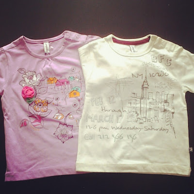 Bluzeczki z długim rękawkiem: fioletowa w kwiatki i kremowa z Nowym Jorkiem.