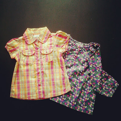 Świetna koszula z krótkim rękawkiem w różowo-pomarańczową kratkę i bluzeczka z długim rękawkiem w kwiatki.
