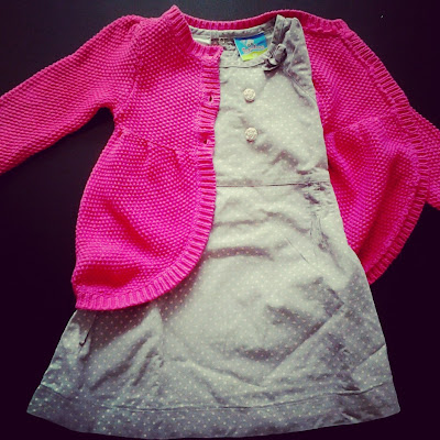 Szara sukienka w różowe kropeczki i różowy sweterek.