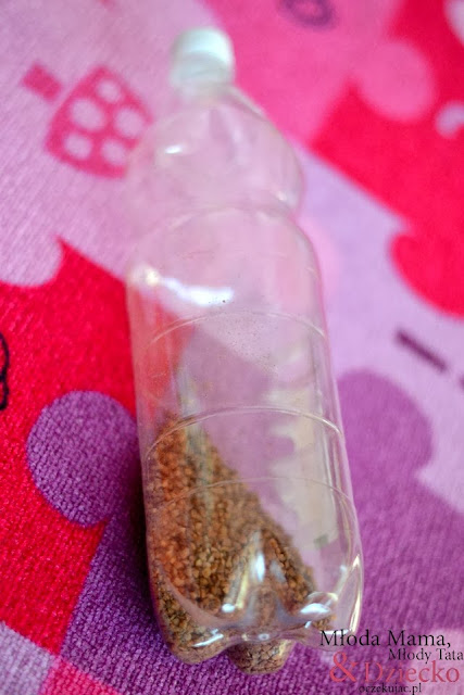 Natomiast tu pierwsza nasza zabawka z odpadka – wykonana już miesiące temu i swego czasu była to jedna z ulubionych grzechotek Gabi – pusta butla po wodzie i garść kaszy.