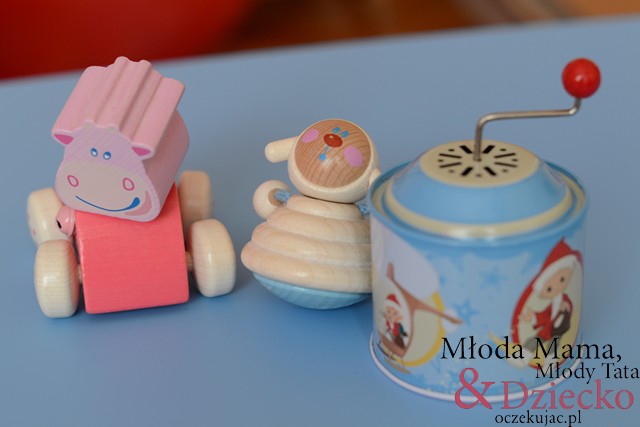 Kołowa krowa i owca – wańka wstańka oraz katarynko-pozytywka – fajne eko i tradycyjne zabawki. Szczególnie sprawdzają się podczas spacerków – Gabi jak dostanie w rączkę w domu, tak nie wypuszcza do powrotu.