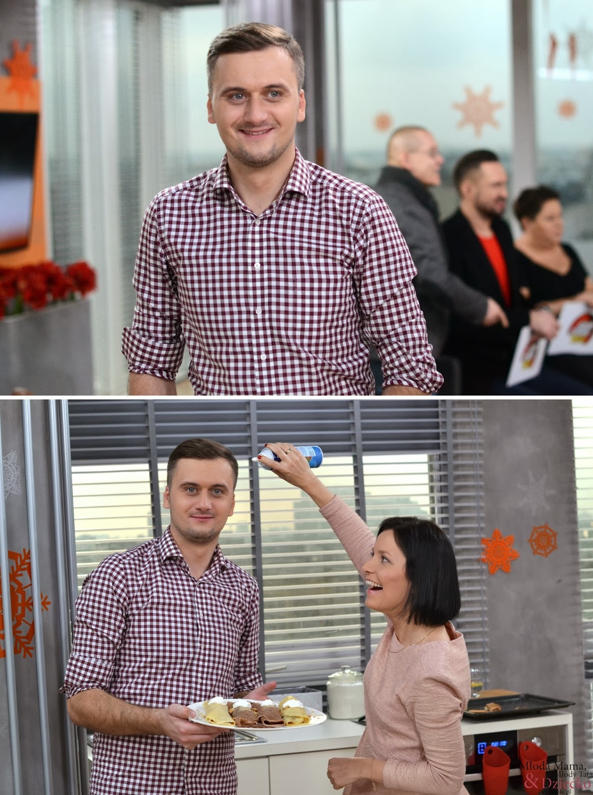 Marcin Prokop odbiera „zamówienie” – dwie sakiewki z owocami. A na drugim foto – ile widzicie osób? A ile z tych osób wcina nasze naleśniory? Podobno dawno nie zdarzyło się by po programie był taki popyt na dania nie typowo mięsne… Najlepsza nagroda dla gotujących – kiedy wszystko znika! 🙂