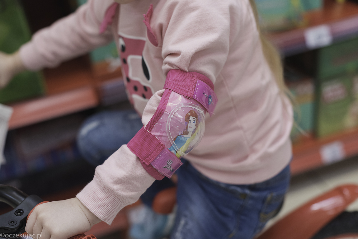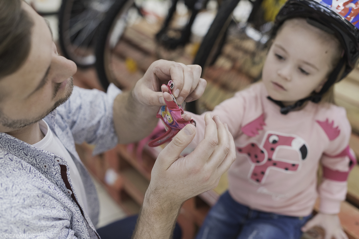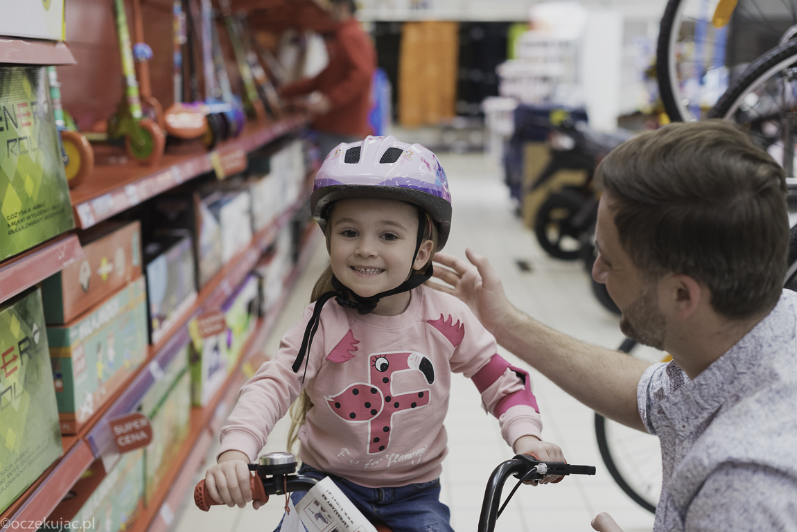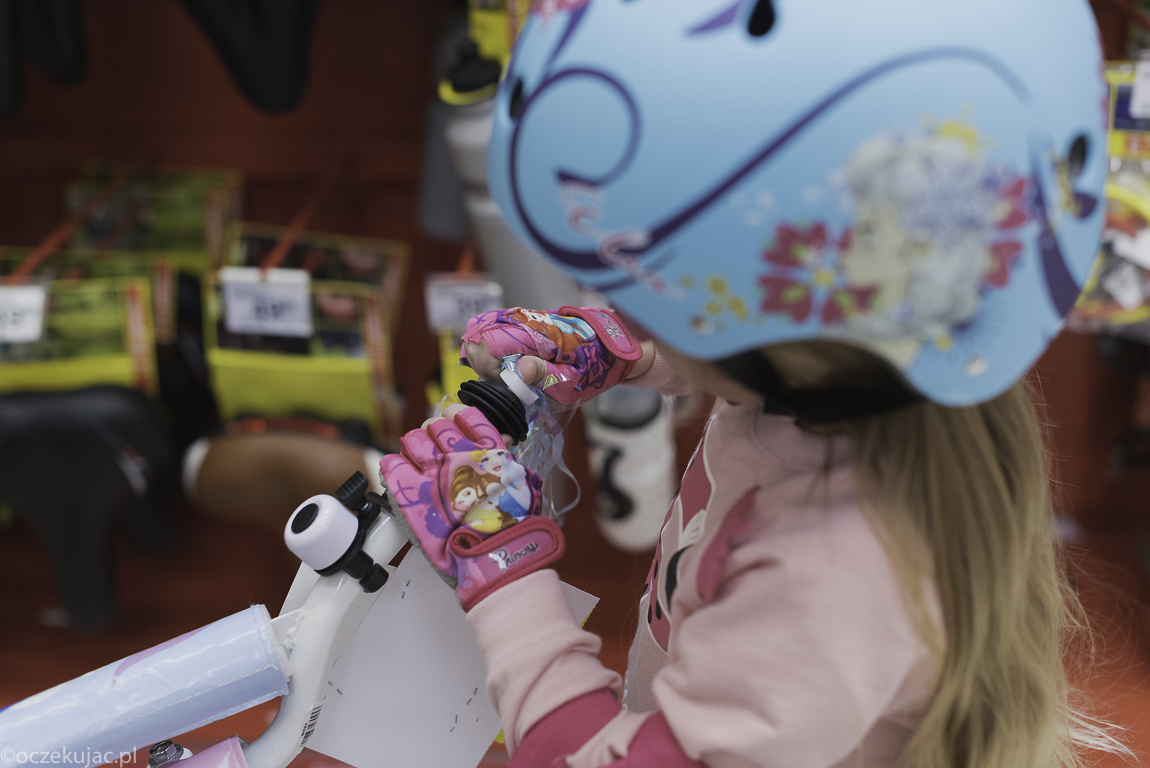 Ale wracając do Gabi… To był jej pierwszy taki świadomy zakup roweru, wiecie – z wybieraniem koloru, przejażdżkami, dopasowywaniem dzwonka, koszyka, wiatraczka… Skoro mamy zdjąć boczne kółka, to oczywiście musiała spędzić kilka dobrych minut przy półce z ochraniaczami, a że były tam takie z myszką Minnie, Krainą Lodu, Minionkami, Autami itp., to wybór był naprawdę trudny 🙂 . Ostatecznie sprawiła sobie komplet do kasku z Krainą Lodu. A jakże! No i obowiązkowo frędzelki do kierownicy… Wybór samego pojazdu też nie był najłatwiejszy, bo jak tu się zdecydować pomiędzy wyścigową biedronką – czerwony rower w czarne kropki a klasykiem dziewczęcym – cukierkowym różowo-fioletowym. Co to się będzie działo? Kiedy już słońce wyjdzie na dobre! Póki co zasuwa po podwórku, a codziennie chce nim jechać też do przedszkola. I nawet pierwsze wywrotki jej nie zniechęciły.