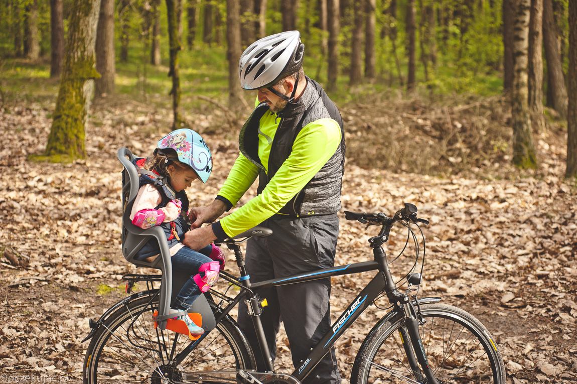 No właśnie, a co ze mną? Rower to moje drugie ja. I choć nie ukrywam, że tęsknię już trochę za jakimiś szalonymi rajdami MTB w terenie w pojedynkę, to wiem, że jeszcze chwilę poczekam, a póki co czerpię ogrom radości z tych naszych powolnych leniwych, odkrywczych przejażdżek z córką, a za chwilę z córkami. Stąd też wybór padł na turystyczny model Fischera ze wszystkim, co taki rower mieć powinien, łącznie z dynamem w piaście koła i amortyzacją z przodu oraz w siodełku, co w markowym egzemplarzu za ok. 1 tys. zł jest super opcją. Od razu do swojej czarnej strzały zamontowałem fotelik dziecięcy, bo Gabi nadal lubi być wożona przez tatę, a i tata lubi, szczególnie rano, kiedy wiosną i latem transport poranny do przedszkola jest potrzebny na już. Fotelik znanej nam dobrze marki Bellelli, z regulowanymi pasami, fajnie wyprofilowany i co istotne montowany do ramy na pałąku stalowym, a nie na bagażniku.