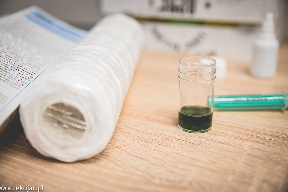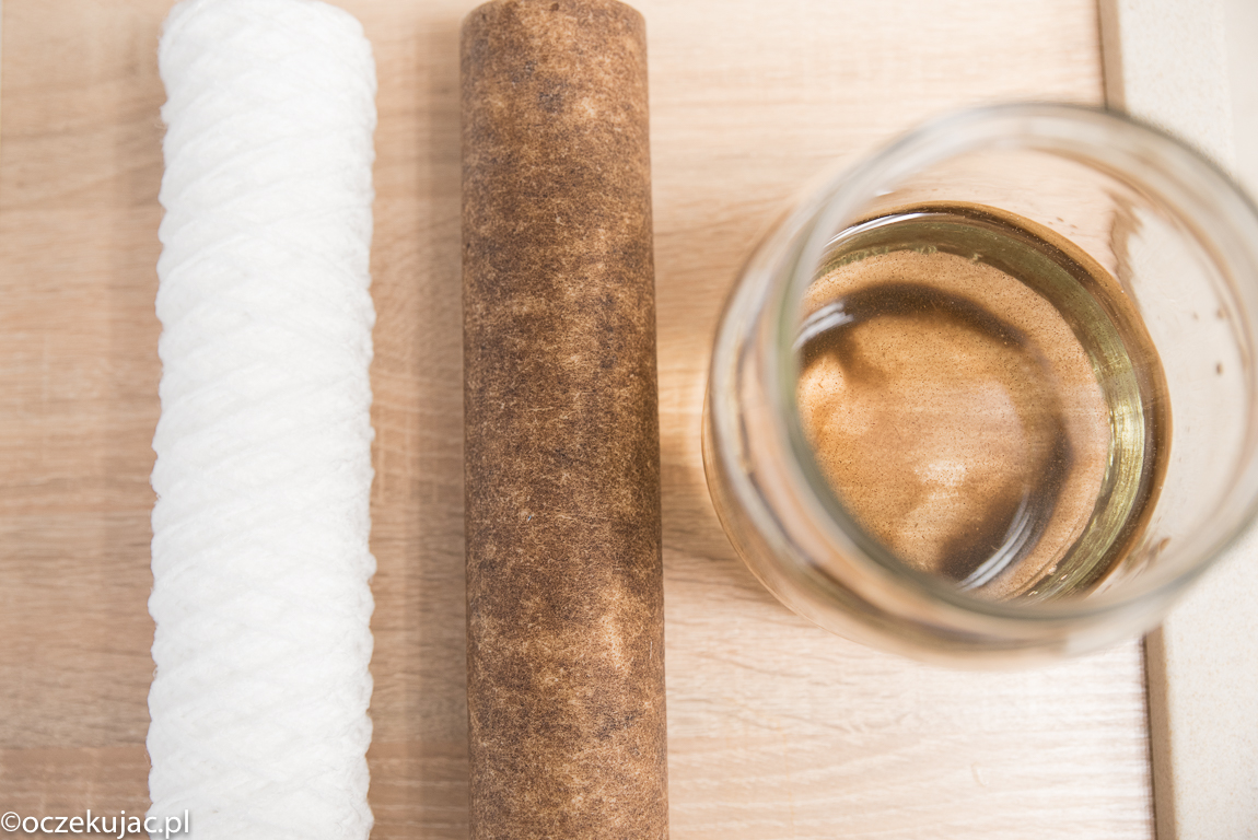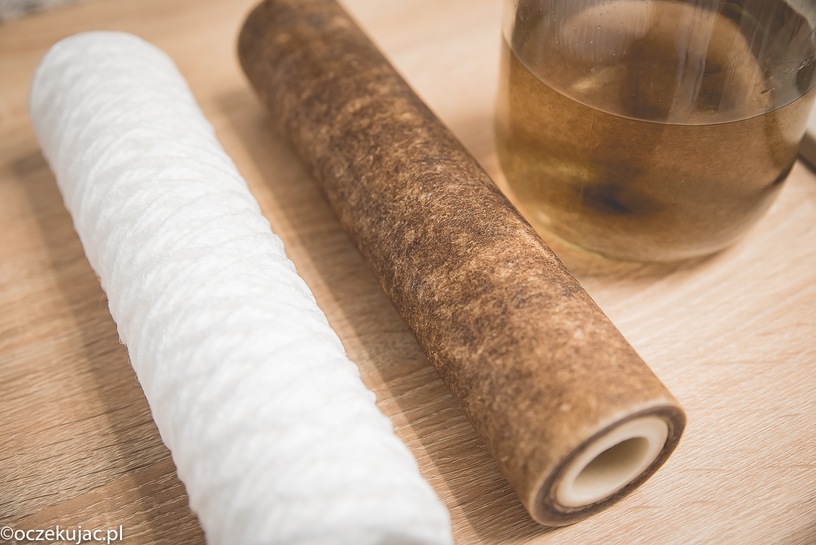 Oprócz zmiękczenia wody warto ją jeszcze przefiltrować, żeby można było pić ją bezpiecznie prosto z kranu. Maria i dziewczynki uwielbiają pić wodę niegazowaną! Stąd drugie urządzenie w zestawie. Ale zanim o nim, to zupełnie podstawowym elementem układu jest prosty filtr sznurkowy wyłapujący zanieczyszczenia o średnicy do 20 mikrometrów. Sami zobaczcie, co zatrzymuje się na takim filtrze w okresie… miesiąca!!! Tak, taka woda dostarczana jest wodociągami do naszych domów. Dla porównania filtr nowy i ten po miesiącu od zamontowania, a w słoiku woda z obudowy filtra. I tu mamy to, co widać, a oprócz tego w wodzie znajdują się związki niewidoczne dla oka ludzkiego i nimi zajmuje się już filtr z węglem aktywnym Aquacarbon.