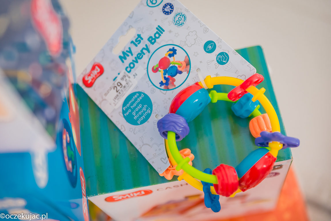 Przed nami etap ząbkowania u Kornelka. Wiemy, że może być różnie, dlatego przygotowujemy się już teraz i zaopatrujemy się w gryzaczek, który będzie jednocześnie świetną zabawką. Wybór w Smyku jest olbrzymi, ostatecznie jednak udało nam się wybrać to – przyciągającą wzrok kulę z ruchomymi elementami. Jest solidnie wykonana, więc bez obaw można podać ją maluszkowi bawiącemu się na macie.