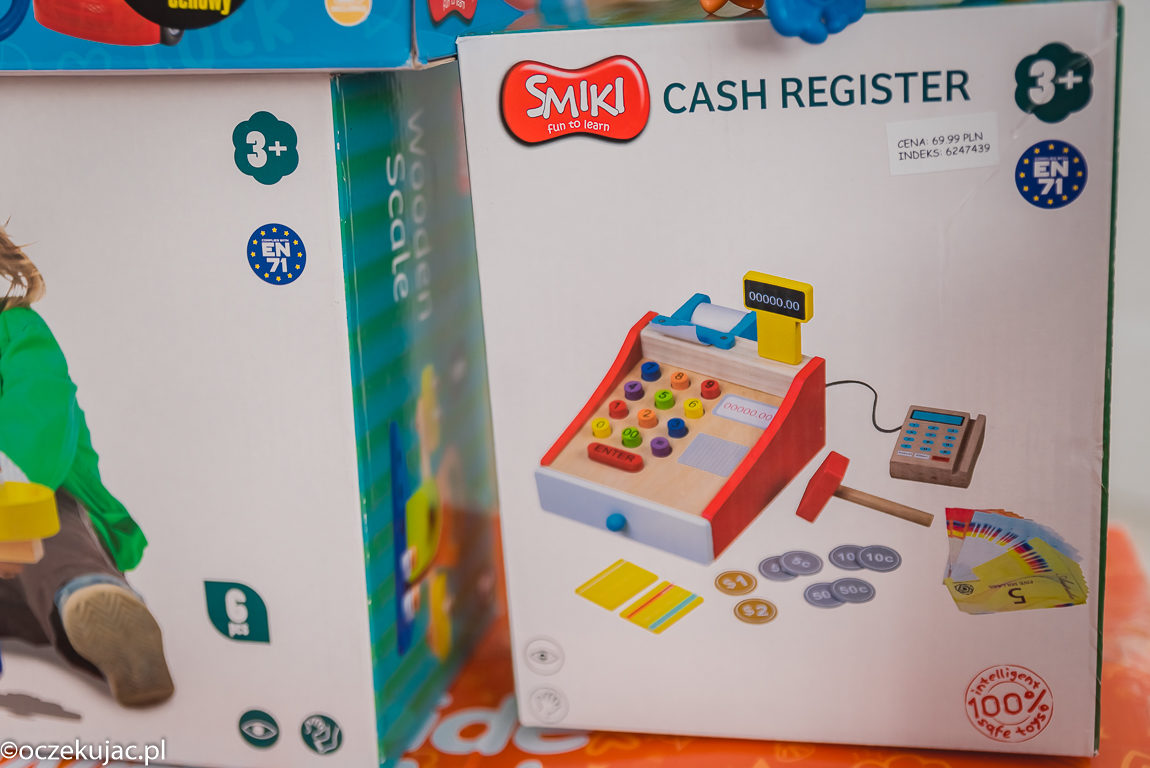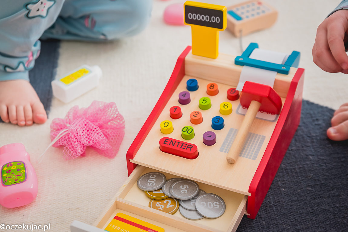 Kasy do zabawy w sklep wraz z akcesoriami znajdziecie niemal w każdym sklepie z zabawkami. Ta jednak, naszym zdaniem, jest wyjątkowa – przekonało nas wykonanie z drewna. Do tego ta estetyka i opcja płacenia za pomocą terminala ?– w końcu dzieciaki mogą bawić się dokładnie tak, jak obserwują to w prawdziwym sklepie, tym bardziej, że ostatnio przy kasie zawsze mamy dym z dwiema – która dziś płaci kartą taty 😀